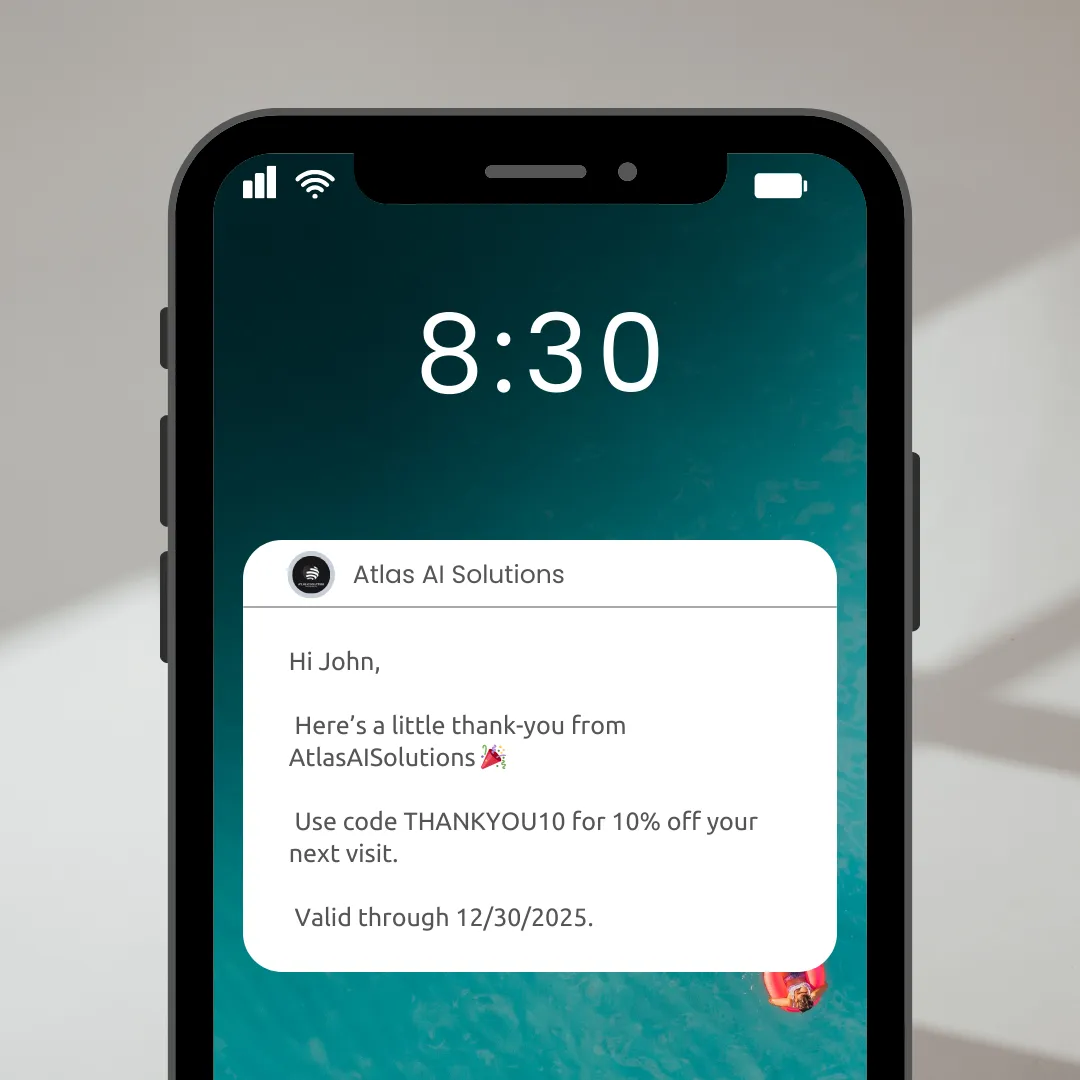 Atlas AI Solutions transformed the way we communicate with our customers. Our SMS giveaway campaign brought in more engagement than anything we’ve done before, and customers loved the instant updates and offers. It’s simple, effective, and has already boosted foot traffic. Highly recommend.